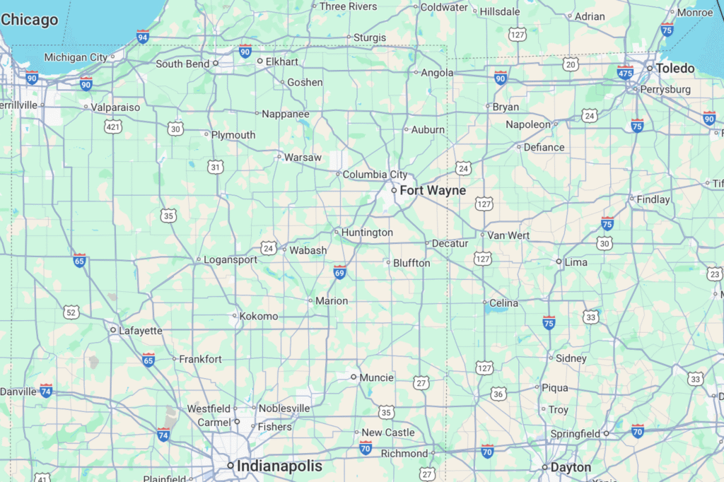 South Bend, Mishawaka, Goshen, Elkhart, Warsaw, Wabash, Huntington, Bluffton, Auburn, Kendallville, New Haven, Van Wert, Decatur, Montpelier, Columbia City, Garrett, Leo-Cedarville, Huntertown, Grabill, Churubusco, Harlan, Defiance, Toledo, Indianapolis, Carmel, Zionsville, Westfield, Greenfield, Dayton, Cincinnati, Detroit, Sterling Heights, Royal Oak, Coldwater, Van Buren, Fort Recovery, Wauseon, Piqua, Lawrence, Ossian, Angola, Marion, Anderson, Muncie, Noblesville, Fishers, Lafayette, Peru, Tipton, Kokomo.